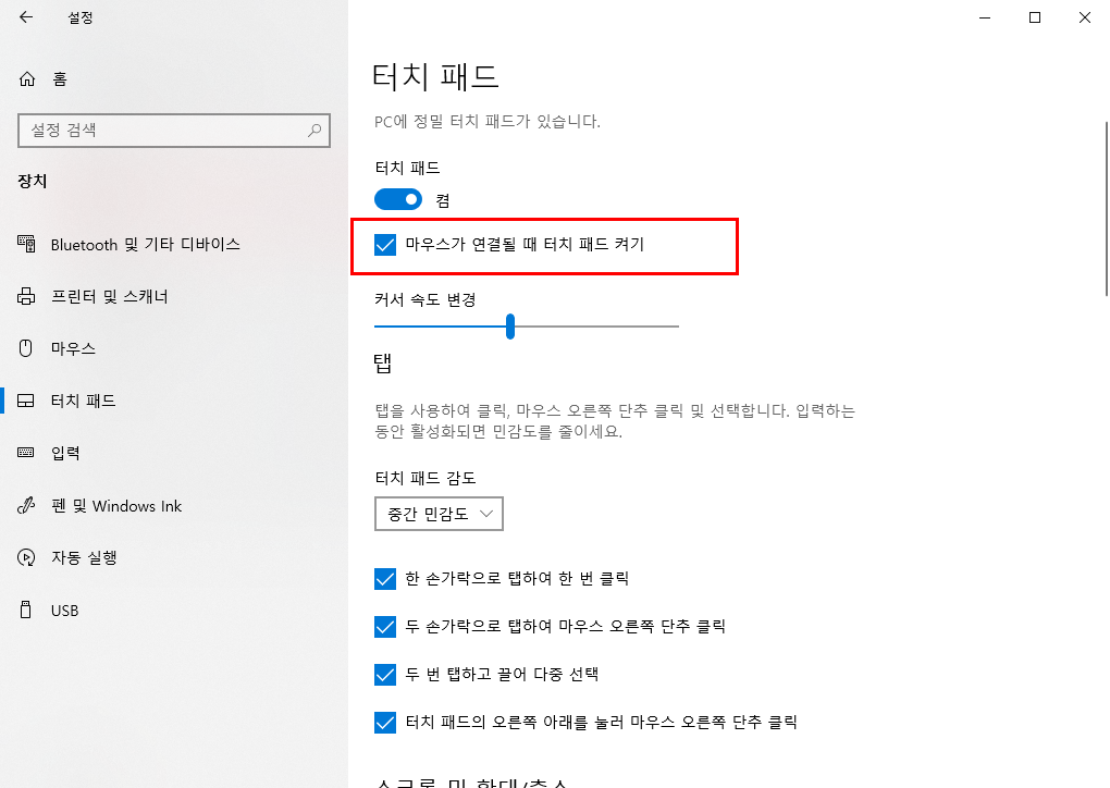 터치 패드란 "마우스가 연결될 때 터치 패드 켜기" 옵션을 선택해 줍니다.