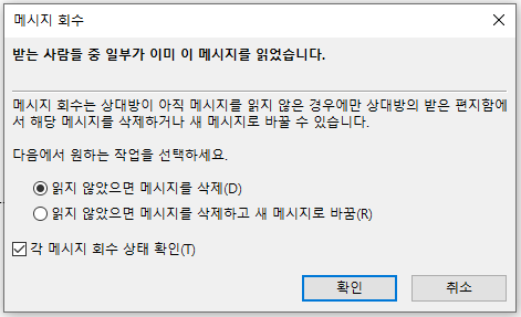메시지 회수 창에서 본인이 원하는 옵션을 선택한 후 확인을 눌러 주면 됩니다.